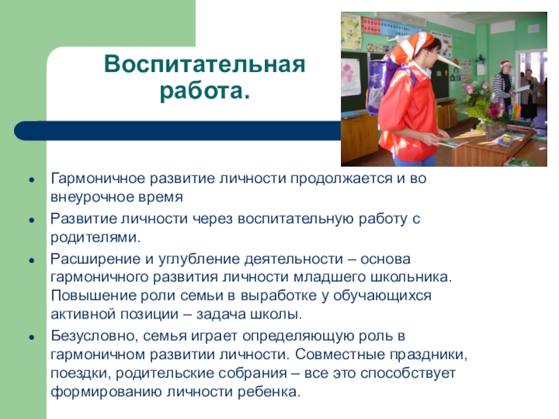 Расширение и углубление деятельности – основа гармоничного развития личности младшего школьника. Повышение роли семьи в выработке у обучающихся активной позиции – задача школы.
