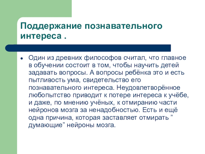 в обучении состоит в том, чтобы научить детей задавать вопросы. А вопросы ребёнка это и есть пытливость ума, свидетельство его познавательного интереса. Неудовлетворённое любопытство приводит к потере интереса к учёбе, и даже, по мнению учёных, к отмиранию части нейронов мозга за ненадобностью. Есть и ещё одна причина, которая заставляет отмирать ”думающие” нейроны мозга.