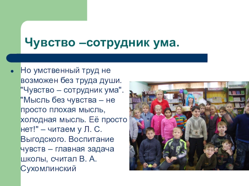 – сотрудник ума". "Мысль без чувства – не просто плохая мысль, холодная мысль. Её просто нет!" – читаем у Л. С. Выгодского. Воспитание чувств – главная задача школы, считал В. А. Сухомлинский