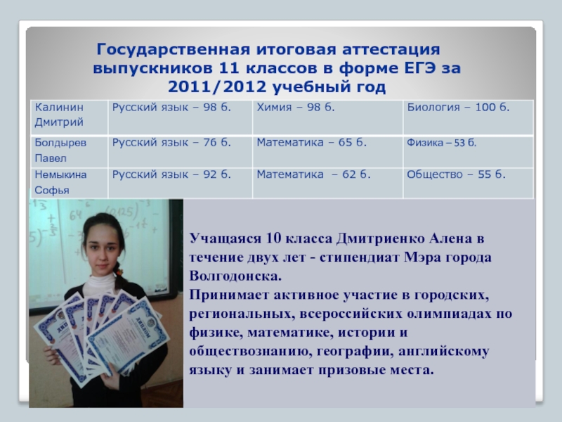 Учащаяся 10 класса Дмитриенко Алена в течение двух лет - стипендиат Мэра города Волгодонска.