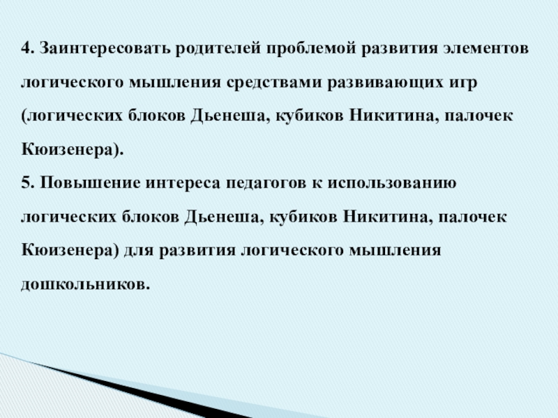 Слайд 64. Заинтересовать родителей проблемой развития элементов логического мышления средствами развивающих игр
