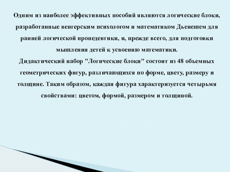 и математиком Дьенешем для ранней логической пропедевтики, и, прежде всего, для подготовки мышления детей к усвоению математики.