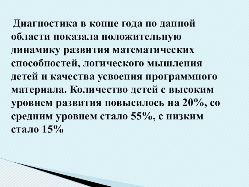 развития математических способностей, логического мышления детей и качества усвоения программного материала. Количество детей с высоким уровнем развития повысилось на 20%, со средним уровнем стало 55%, с низким стало 15%