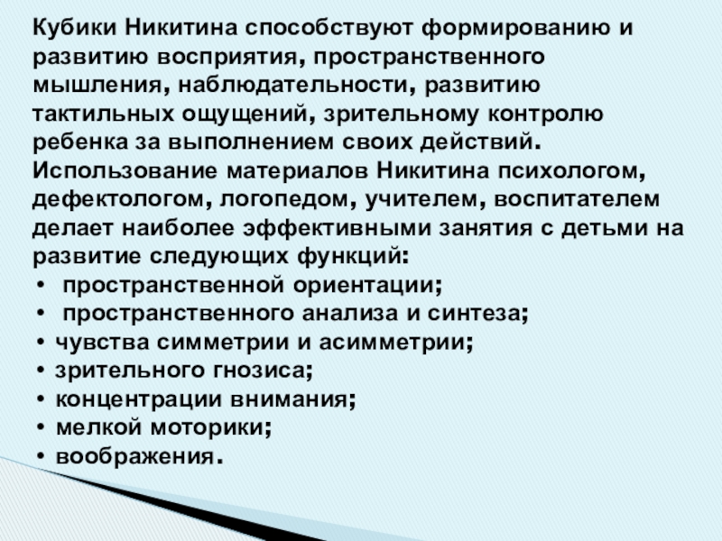 Использование материалов Никитина психологом, дефектологом, логопедом, учителем, воспитателем делает наиболее эффективными занятия с детьми на развитие следующих функций:
