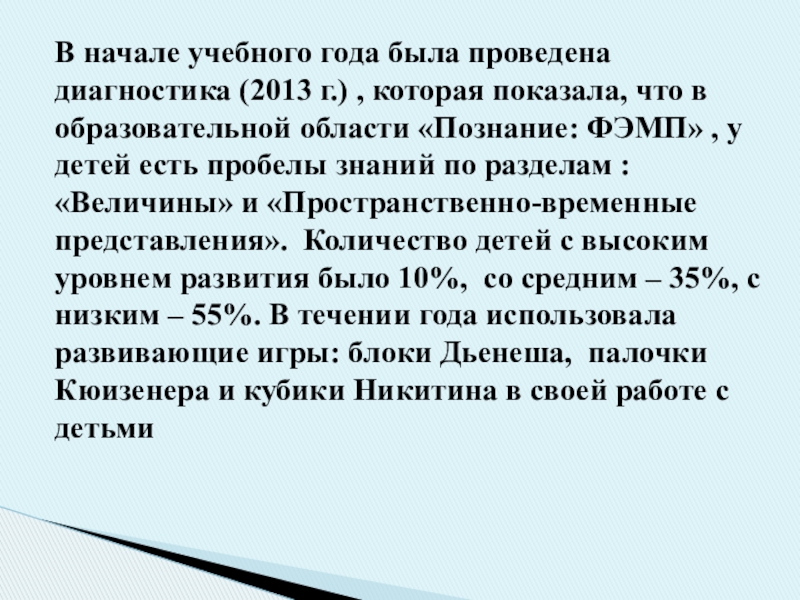 показала, что в образовательной области «Познание: ФЭМП» , у детей есть пробелы знаний по разделам : «Величины» и «Пространственно-временные представления». Количество детей с высоким уровнем развития было 10%, со средним – 35%, с низким – 55%. В течении года использовала развивающие игры: блоки Дьенеша, палочки Кюизенера и кубики Никитина в своей работе с детьми