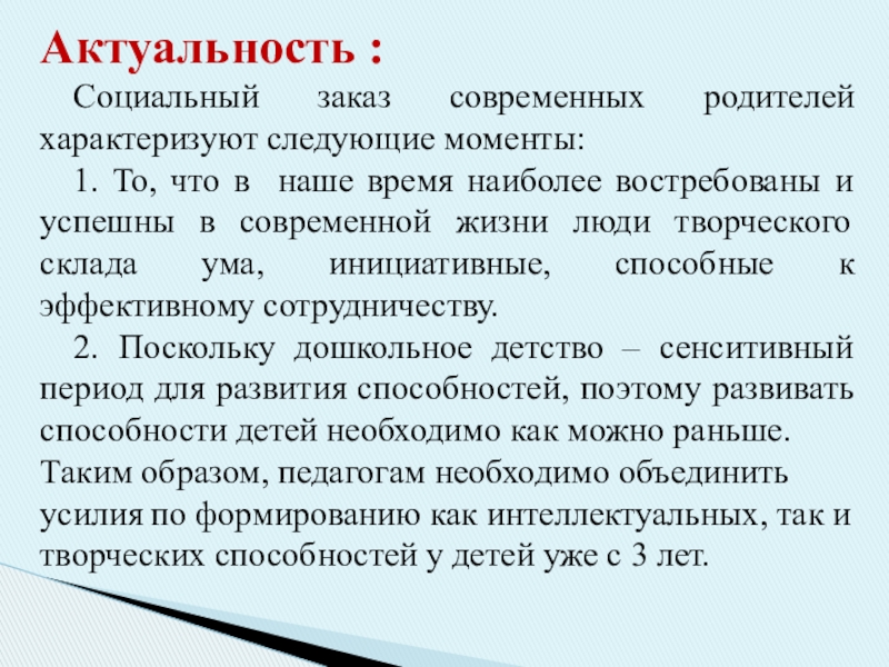2. Поскольку дошкольное детство – сенситивный период для развития способностей, поэтому развивать способности детей необходимо как можно раньше.