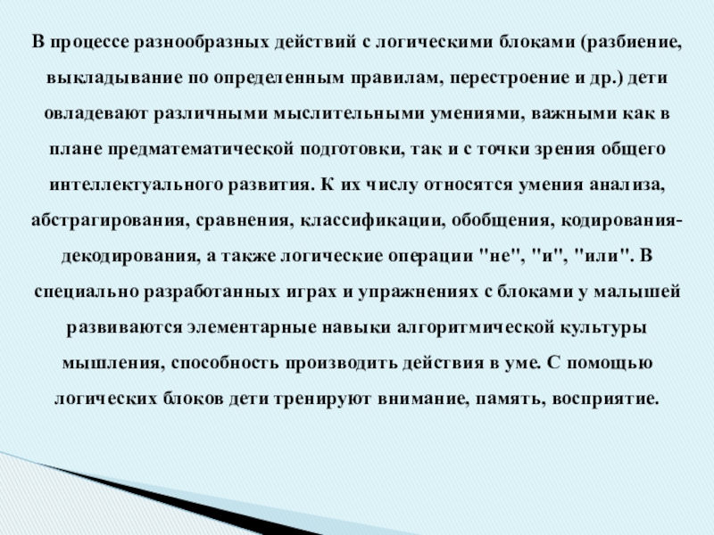 правилам, перестроение и др.) дети овладевают различными мыслительными умениями, важными как в плане предматематической подготовки, так и с точки зрения общего интеллектуального развития. К их числу относятся умения анализа, абстрагирования, сравнения, классификации, обобщения, кодирования-декодирования, а также логические операции "не", "и", "или". В специально разработанных играх и упражнениях с блоками у малышей развиваются элементарные навыки алгоритмической культуры мышления, способность производить действия в уме. С помощью логических блоков дети тренируют внимание, память, восприятие.