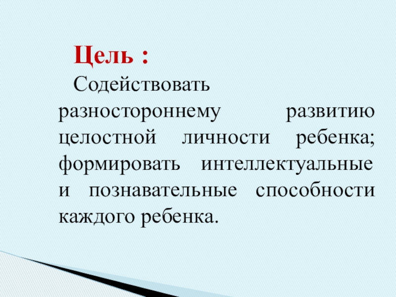 Содействовать разностороннему развитию целостной личности ребенка; формировать интеллектуальные и познавательные