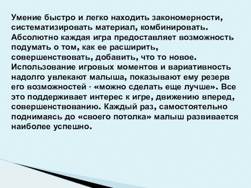 Слайд 21Умение быстро и легко находить закономерности, систематизировать материал, комбинировать. Абсолютно каждая