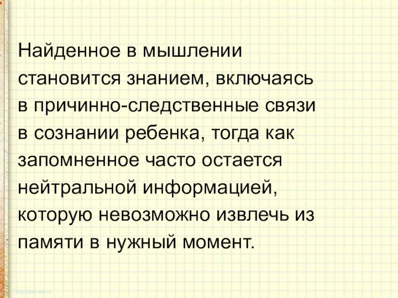 состоит в том, что новые знания не даются в готовом виде. Дети «открывают» их сами в процессе самостоятельной исследовательской деятельности. Они становятся маленькими учёными, делающими свое собственное открытие.