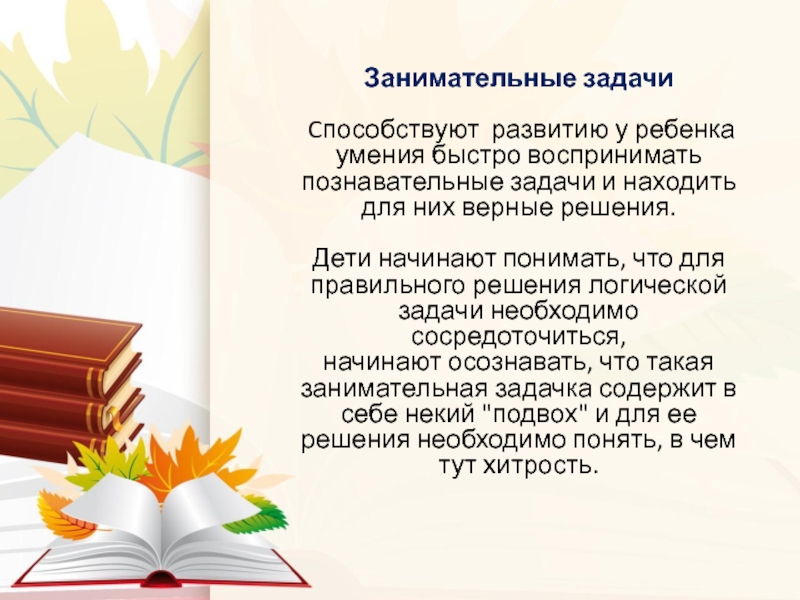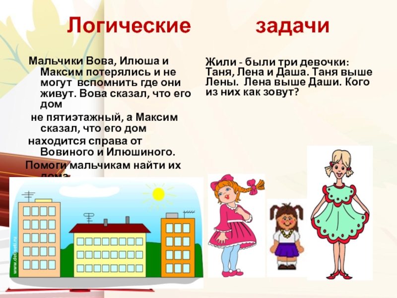 логические задачи подбираются с учетом возрастных особенностей детей.