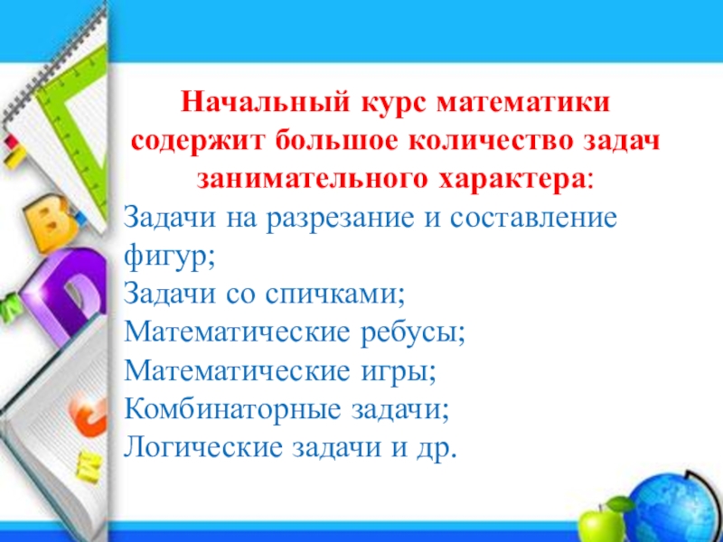 Слайд 4Начальный курс математики содержит большое количество задач занимательного характера: