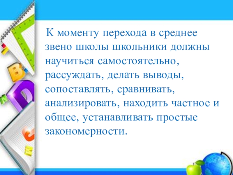 Слайд 21 К моменту перехода в среднее звено школы школьники должны