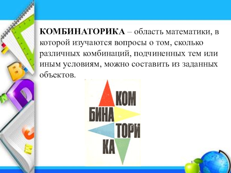 Слайд 12КОМБИНАТОРИКА – область математики, в которой изучаются вопросы о том, сколько