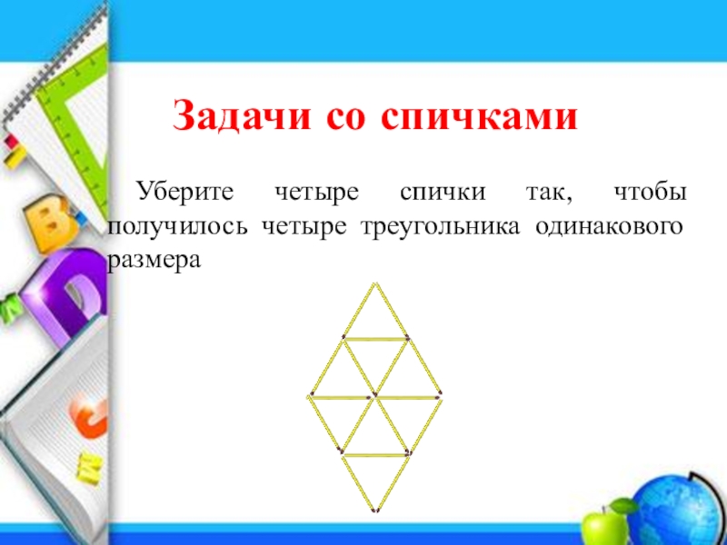 Уберите четыре спички так, чтобы получилось четыре треугольника одинакового