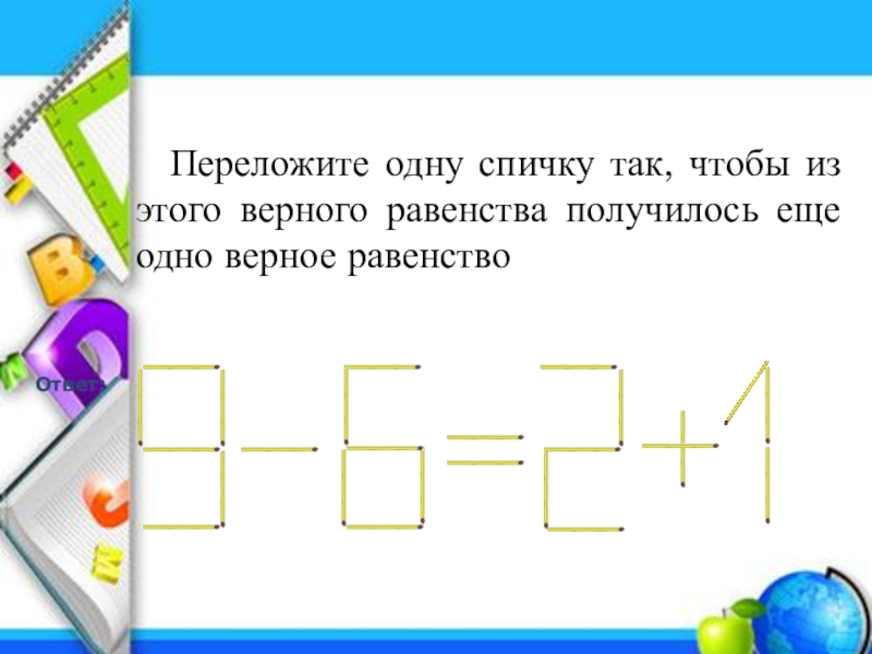 Слайд 6Переложите одну спичку так, чтобы из этого верного равенства получилось еще