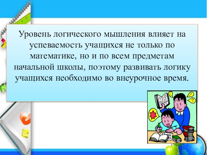 Слайд 20Уровень логического мышления влияет на успеваемость учащихся не только по математике,