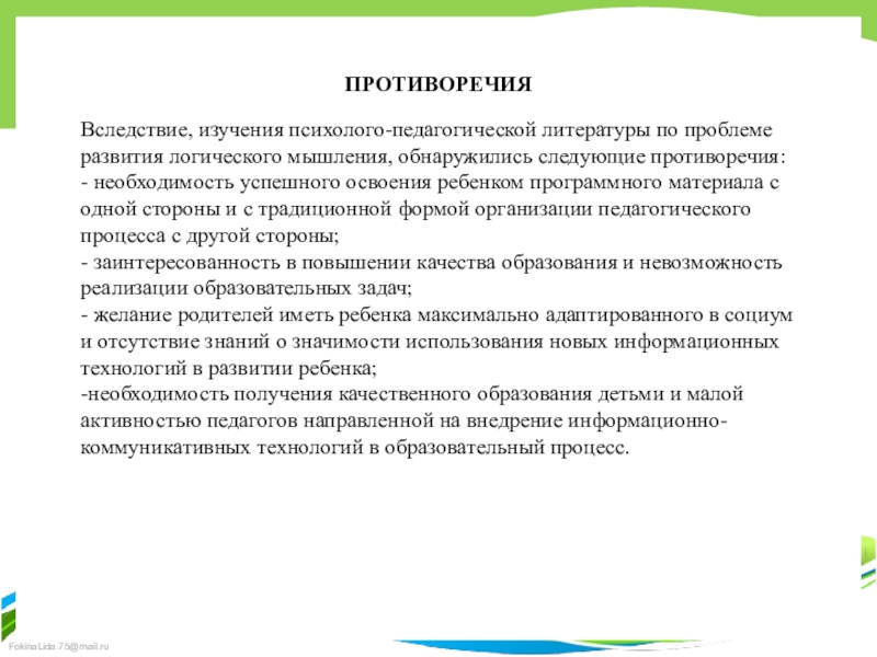Вследствие, изучения психолого-педагогической литературы по проблеме развития логического мышления, обнаружились следующие