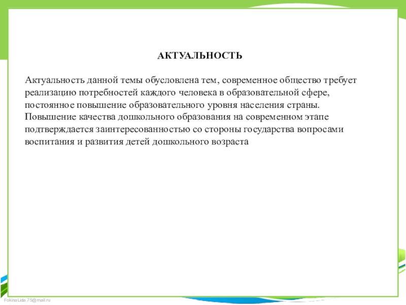 Повышение качества дошкольного образования на современном этапе подтверждается заинтересованностью со стороны государства вопросами воспитания и развития детей дошкольного возраста