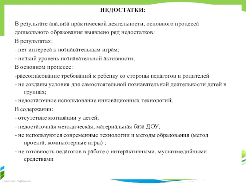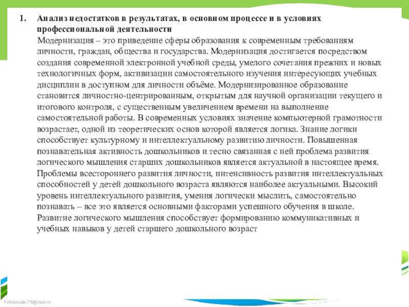 Слайд 2Анализ недостатков в результатах, в основном процессе и в условиях профессиональной