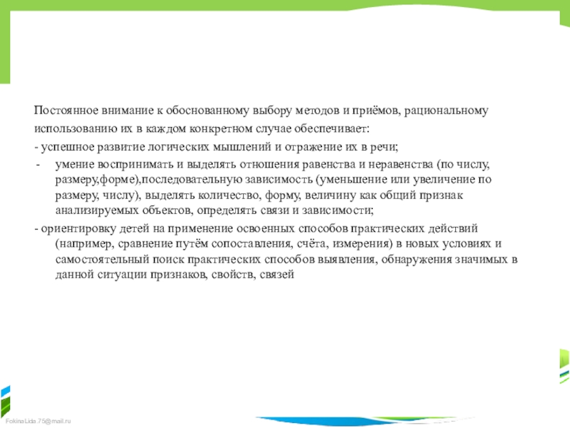 Слайд 10Постоянное внимание к обоснованному выбору методов и приёмов, рациональному