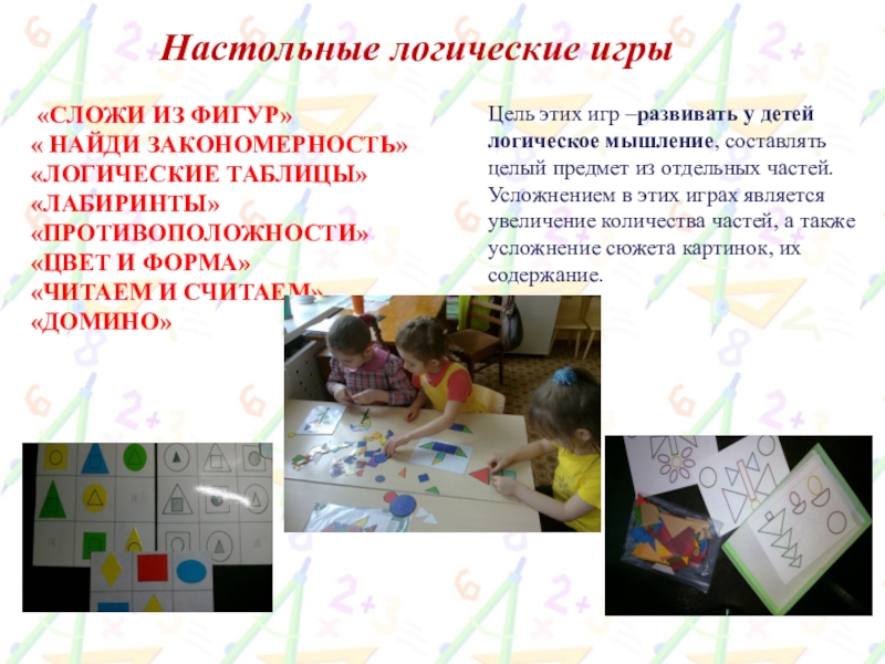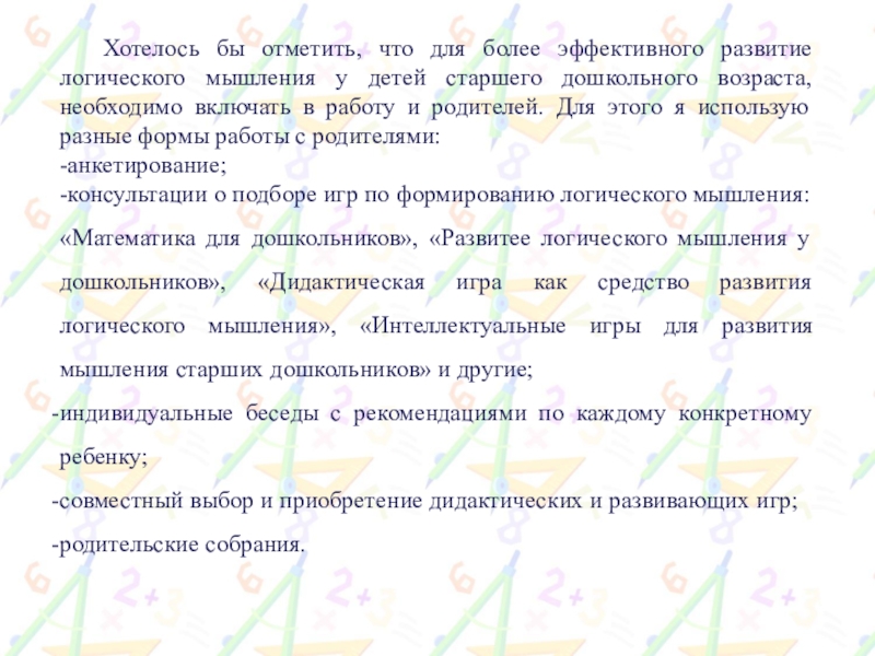 -консультации о подборе игр по формированию логического мышления: «Математика для дошкольников», «Развитее логического мышления у дошкольников», «Дидактическая игра как средство развития логического мышления», «Интеллектуальные игры для развития мышления старших дошкольников» и другие;