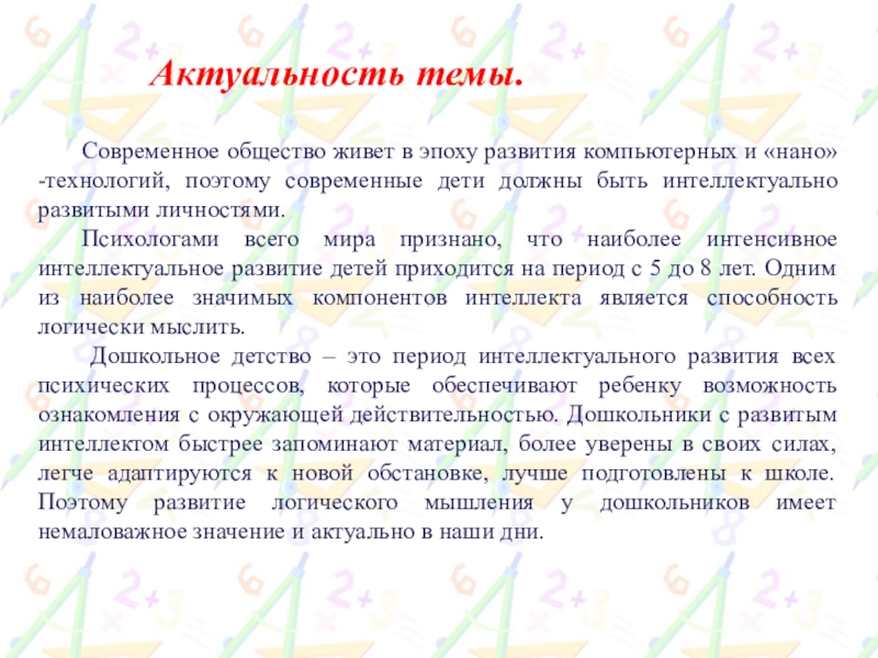 компьютерных и «нано»-технологий, поэтому современные дети должны быть интеллектуально развитыми личностями.
