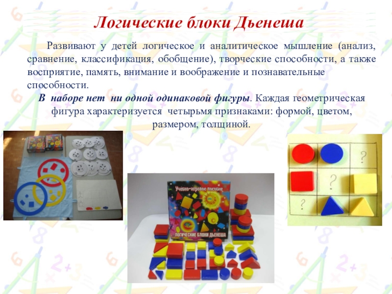 В наборе нет ни одной одинаковой фигуры. Каждая геометрическая фигура характеризуется четырьмя признаками: формой, цветом, размером, толщиной.