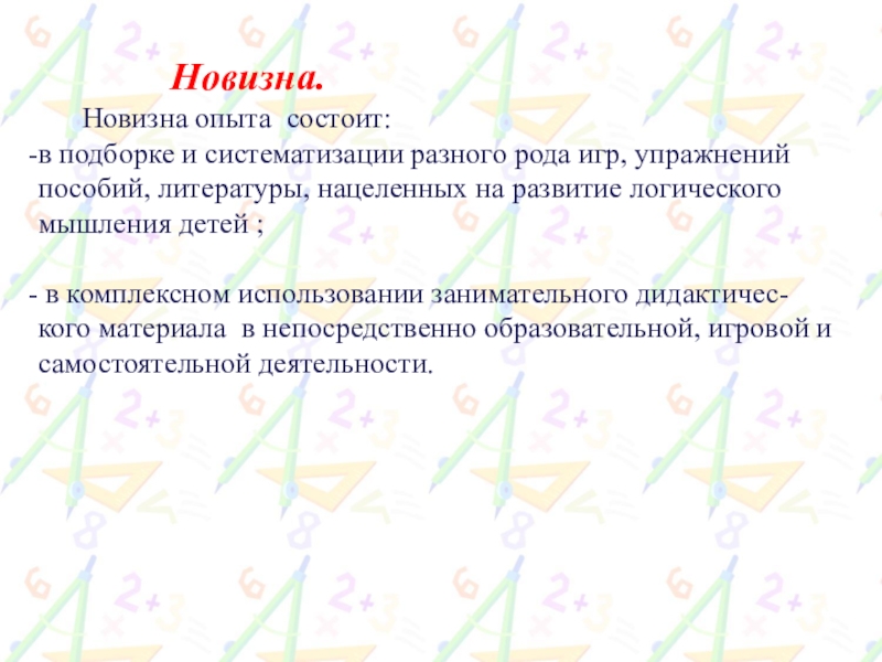 Развитие логического мышления включает в себя целенаправленное использование развивающих и дидактических игр. Игры логического содержания помогают воспитывать у детей познавательный интерес, способствовать исследовательскому и творческому поиску, желание и умение учиться.