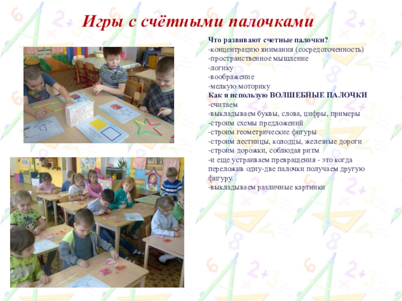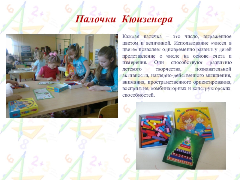 величиной. Использование «чисел в цвете» позволяет одновременно развить у детей представление о числе на основе счета и измерения. Они способствуют развитию детского творчества, познавательной активности, наглядно-действенного мышления, внимания, пространственного ориентирования, восприятия, комбинаторных и конструкторских способностей.