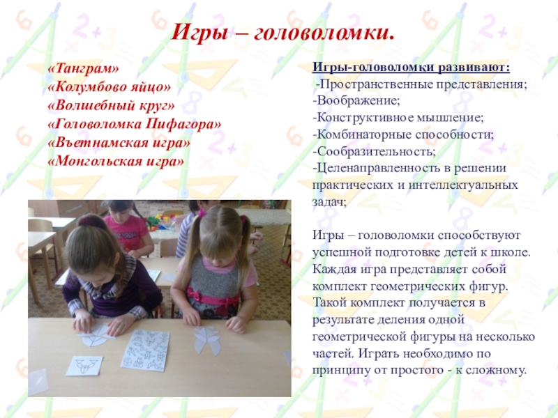 Игры – головоломки способствуют успешной подготовке детей к школе.