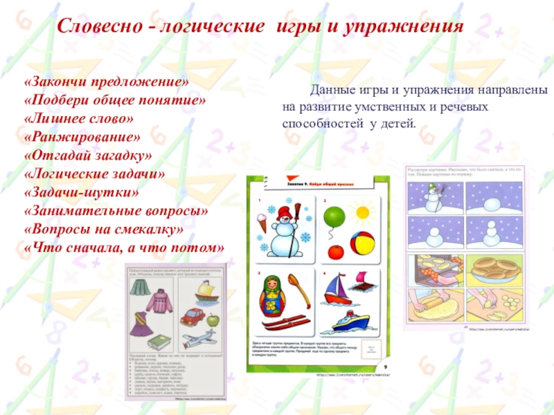 Данные игры и упражнения направлены на развитие умственных и речевых способностей у детей.