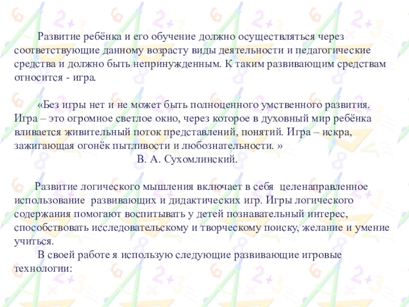 «Без игры нет и не может быть полноценного умственного развития. Игра – это огромное светлое окно, через которое в духовный мир ребёнка вливается живительный поток представлений, понятий. Игра – искра, зажигающая огонёк пытливости и любознательности. »