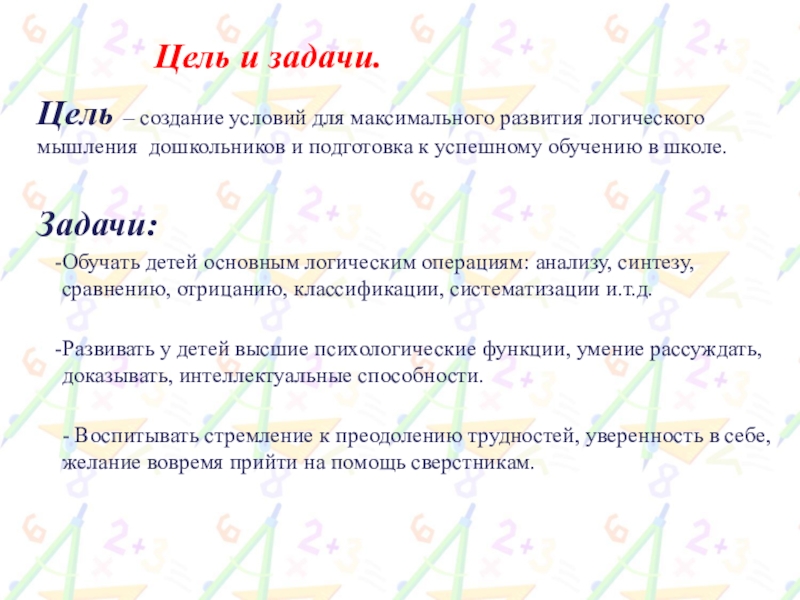 Развивать у детей высшие психологические функции, умение рассуждать, доказывать, интеллектуальные способности.