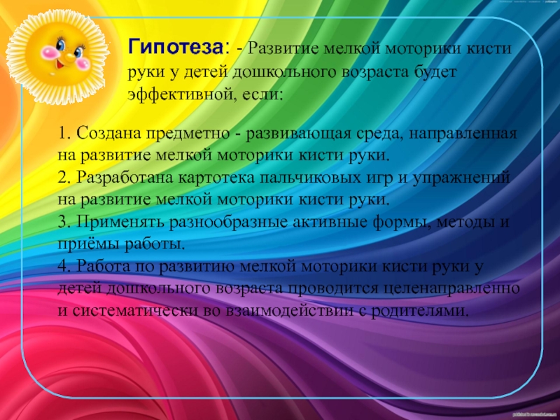 Гипотеза: - Развитие мелкой моторики кисти руки у детей дошкольного возраста будет эффективной, если: