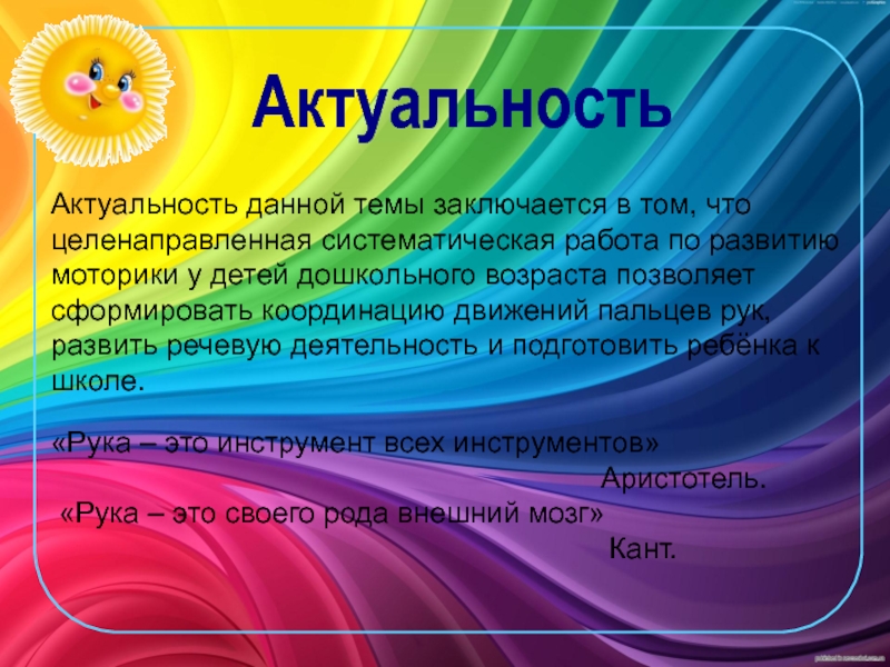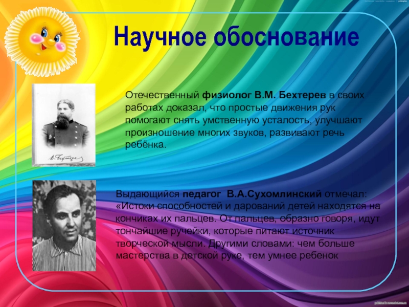 Выдающийся педагог В.А.Сухомлинский отмечал: «Истоки способностей и дарований детей находятся на кончиках их пальцев. От пальцев, образно говоря, идут тончайшие ручейки, которые питают источник творческой мысли. Другими словами: чем больше мастерства в детской руке, тем умнее ребенок