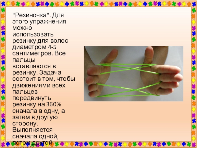 сантиметров. Все пальцы вставляются в резинку. Задача состоит в том, чтобы движениями всех пальцев передвинуть резинку на 360% сначала в одну, а затем в другую сторону. Выполняется сначала одной, потом другой ру6кой.