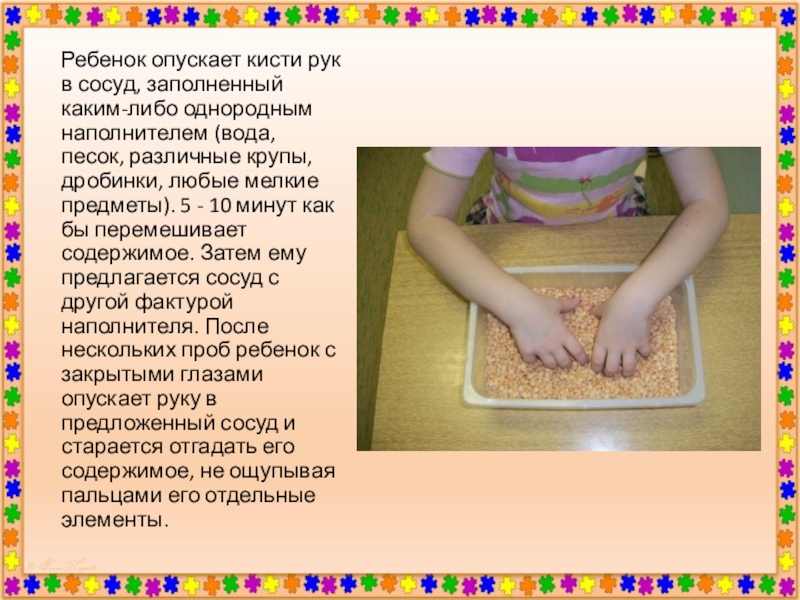 Слайд 2Ребенок опускает кисти рук в сосуд, заполненный каким-либо однородным наполнителем (вода,