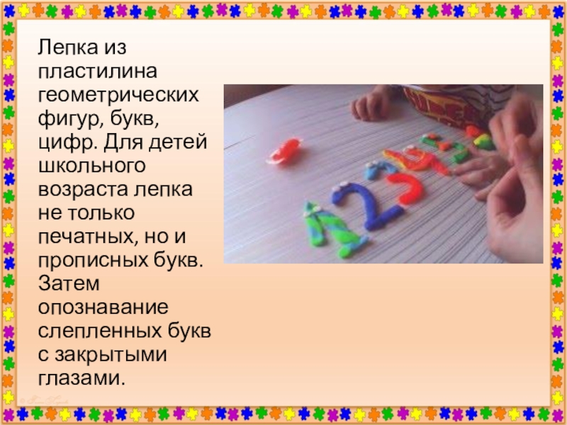 Слайд 5Лепка из пластилина геометрических фигур, букв, цифр. Для детей школьного возраста