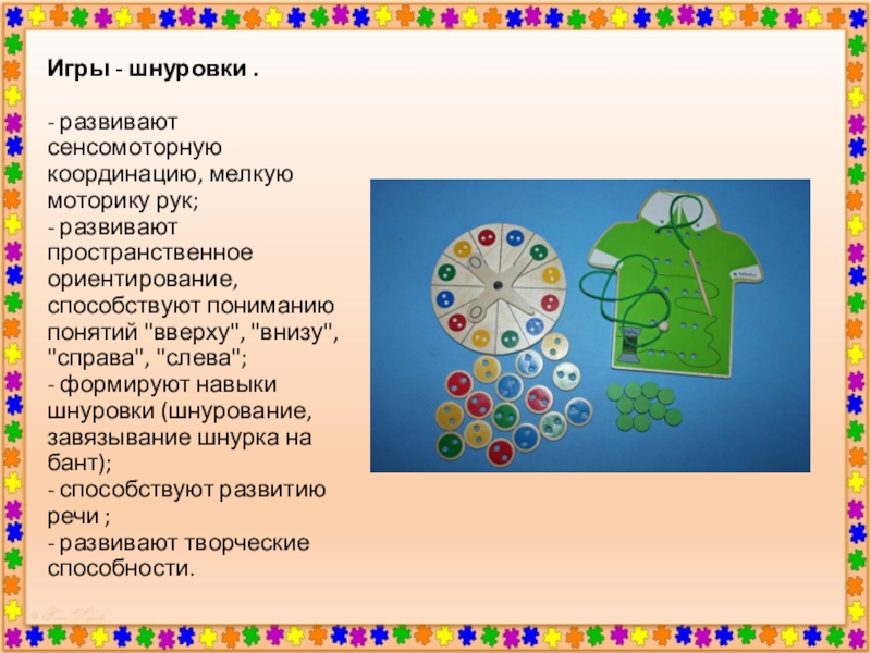 пространственное ориентирование, способствуют пониманию понятий "вверху", "внизу", "справа", "слева";  - формируют навыки шнуровки (шнурование, завязывание шнурка на бант);  - способствуют развитию речи ;  - развивают творческие способности.