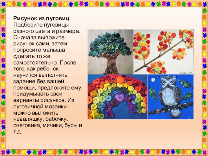 рисунок сами, затем попросите малыша сделать то же самостоятельно. После того, как ребенок научится выполнять задание без вашей помощи, предложите ему придумывать свои варианты рисунков. Из пуговичной мозаики можно выложить неваляшку, бабочку, снеговика, мячики, бусы и т.д.