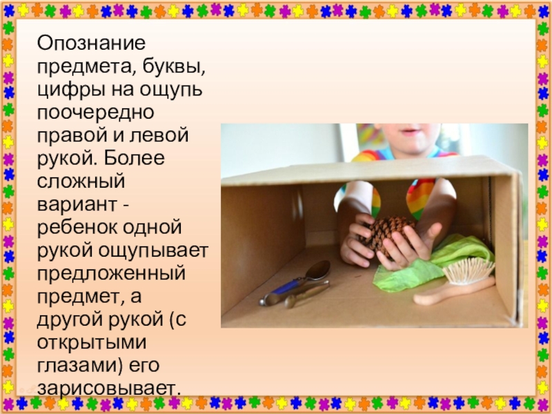 Слайд 4Опознание предмета, буквы, цифры на ощупь поочередно правой и левой рукой.