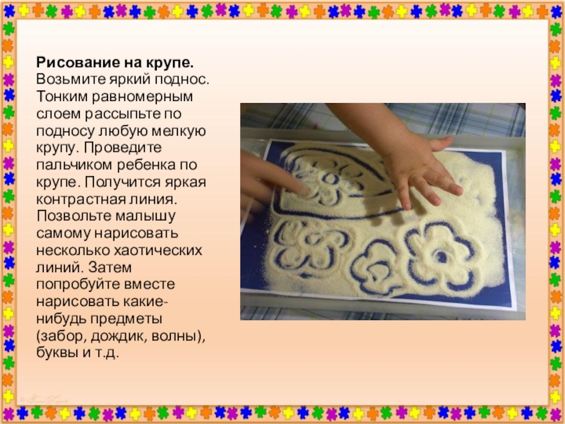 Слайд 9Рисование на крупе. Возьмите яркий поднос. Тонким равномерным слоем рассыпьте по