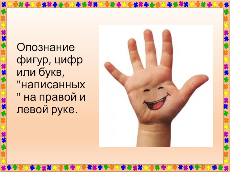 Слайд 3Опознание фигур, цифр или букв, "написанных" на правой и левой руке.