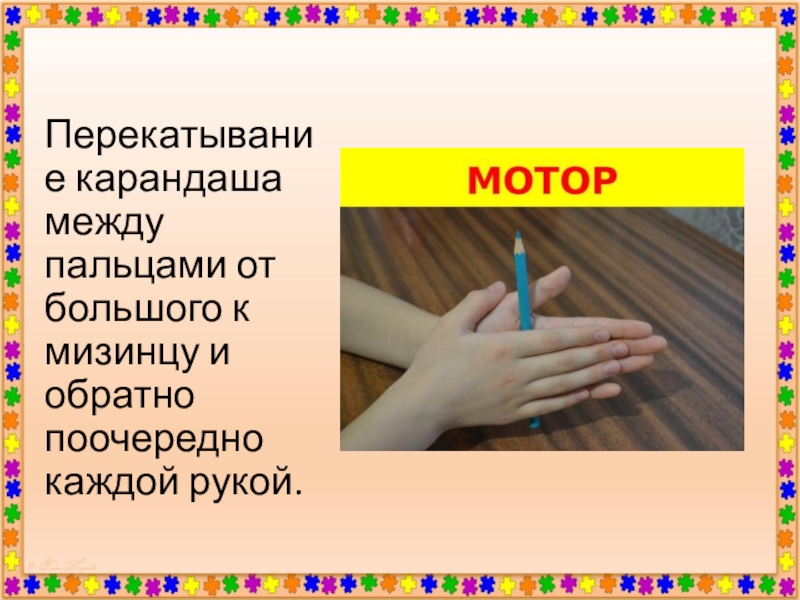 Слайд 7Перекатывание карандаша между пальцами от большого к мизинцу и обратно поочередно