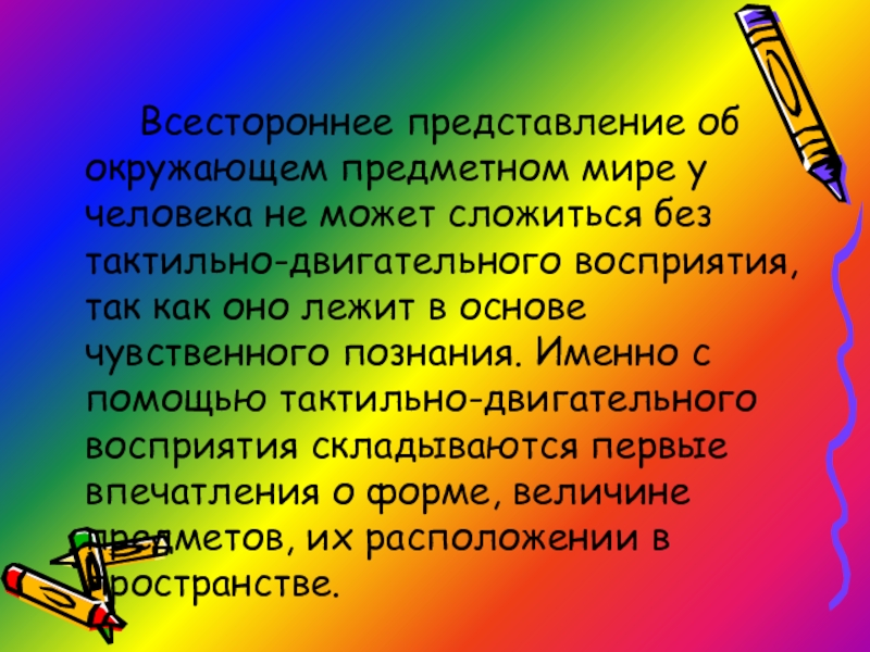 без тактильно-двигательного восприятия, так как оно лежит в основе чувственного познания. Именно с помощью тактильно-двигательного восприятия складываются первые впечатления о форме, величине предметов, их расположении в пространстве.