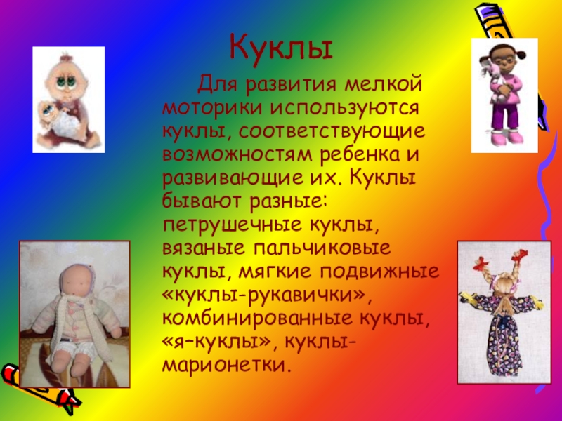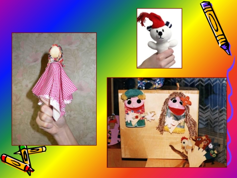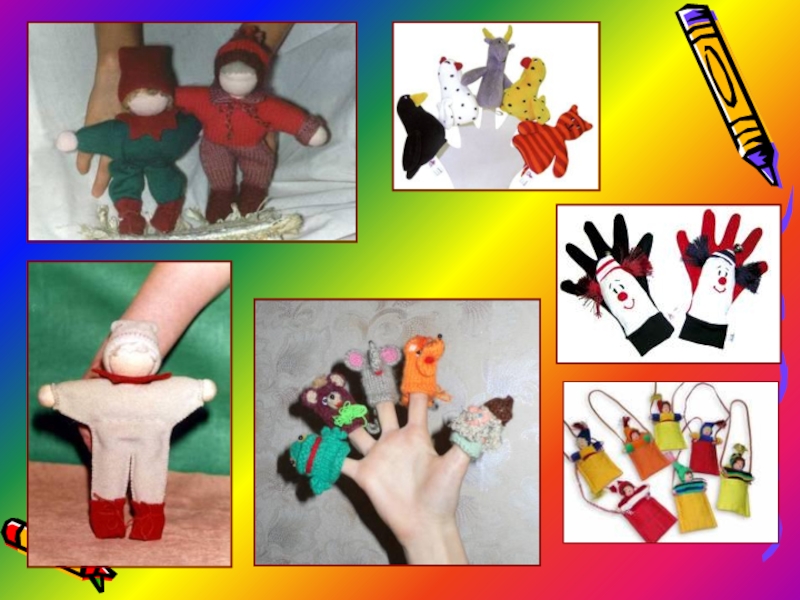 их. Куклы бывают разные: петрушечные куклы, вязаные пальчиковые куклы, мягкие подвижные «куклы-рукавички», комбинированные куклы, «я–куклы», куклы-марионетки.