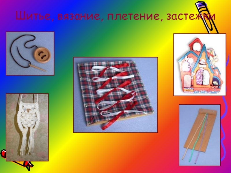 Слайд 24Шитье, вязание, плетение, застежки
