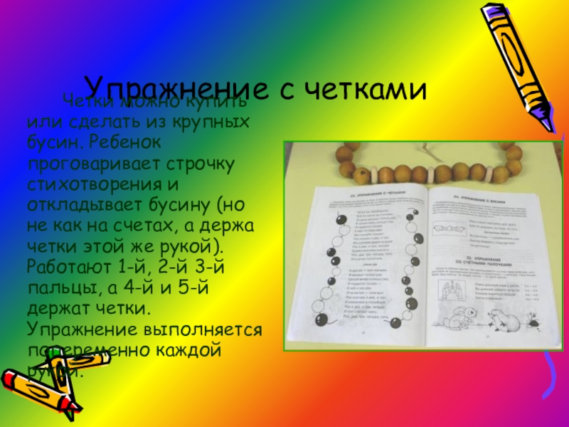 проговаривает строчку стихотворения и откладывает бусину (но не как на счетах, а держа четки этой же рукой). Работают 1-й, 2-й 3-й пальцы, а 4-й и 5-й держат четки. Упражнение выполняется попеременно каждой рукой.