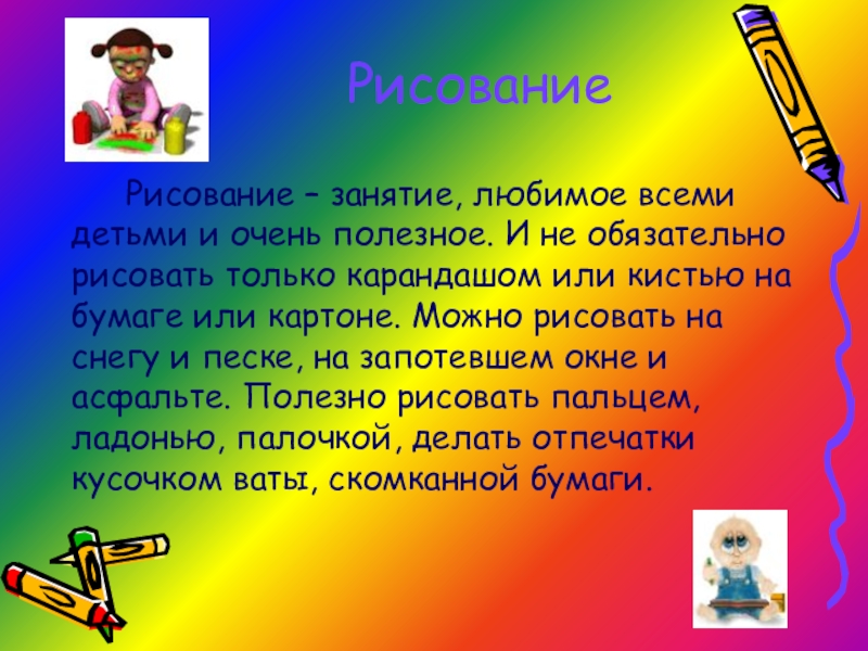 обязательно рисовать только карандашом или кистью на бумаге или картоне. Можно рисовать на снегу и песке, на запотевшем окне и асфальте. Полезно рисовать пальцем, ладонью, палочкой, делать отпечатки кусочком ваты, скомканной бумаги.